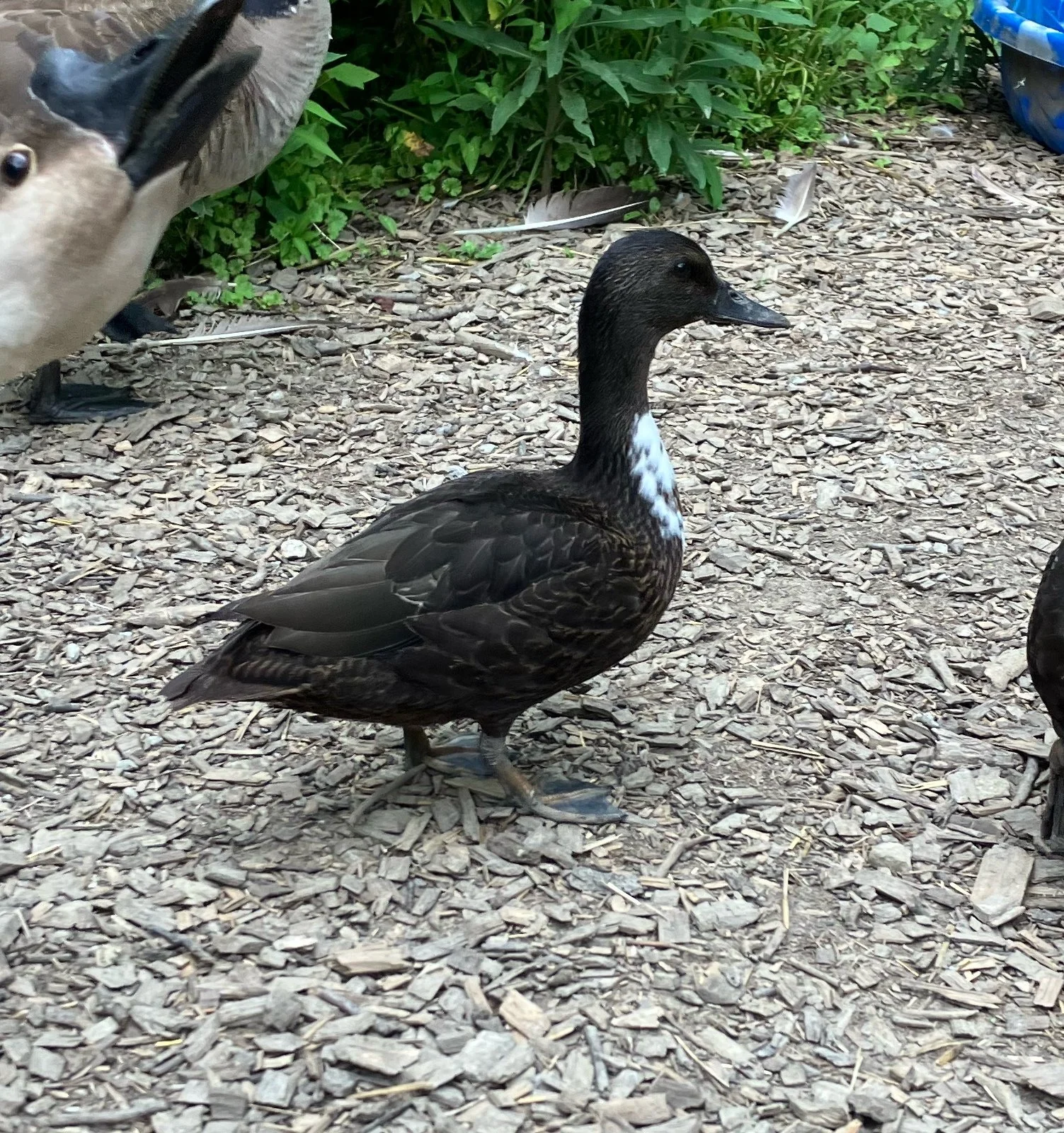 This duck was one of 5 Mallard and American Black ducks that were rescued North of Columbus and turned away from the wildlife rescue in that area because they were “domestic”. Now that we’ve raised them, they live on the pasture of misfit ducks until they fly away (which almost never happens because they end up bonded to the other domestic ducks.