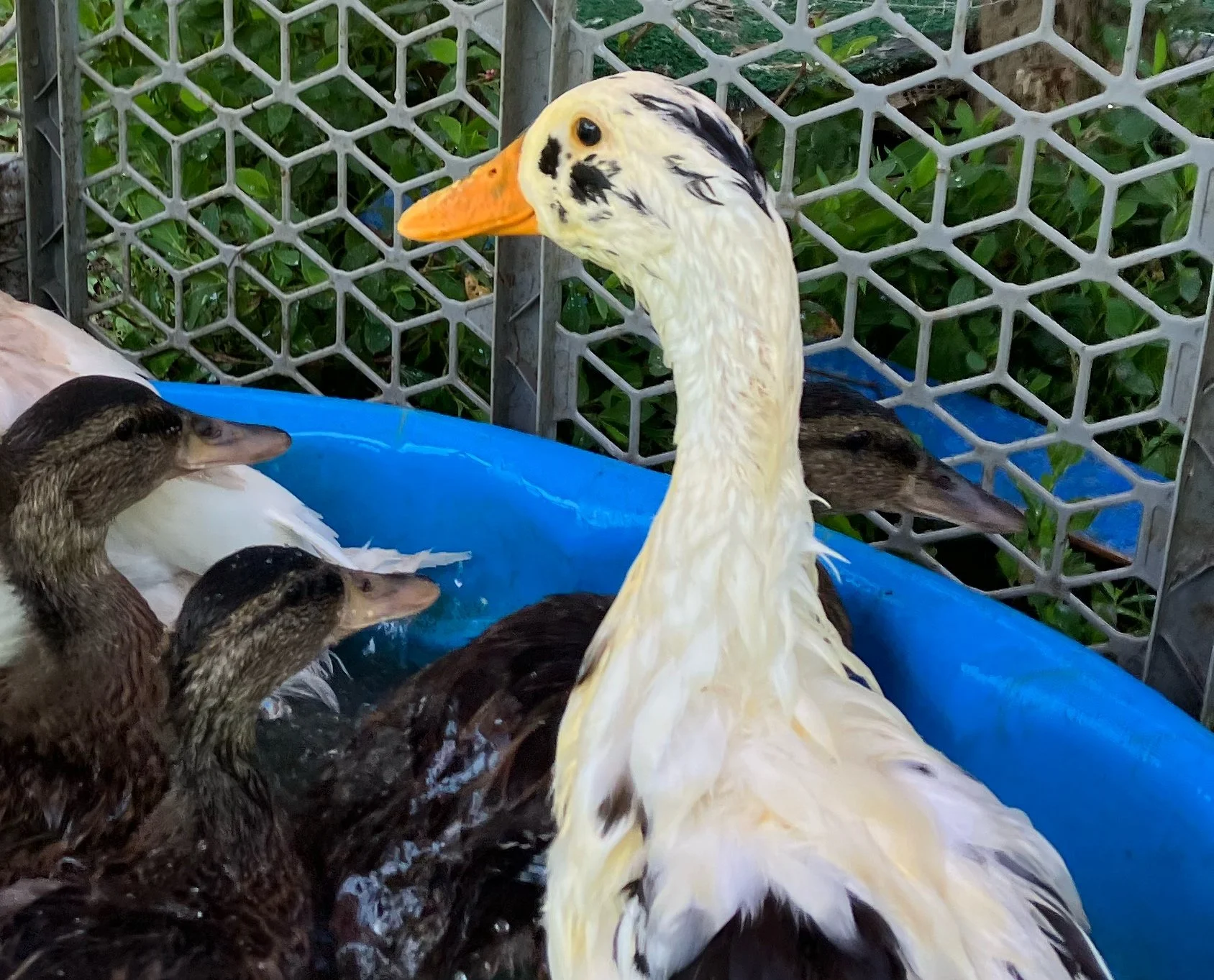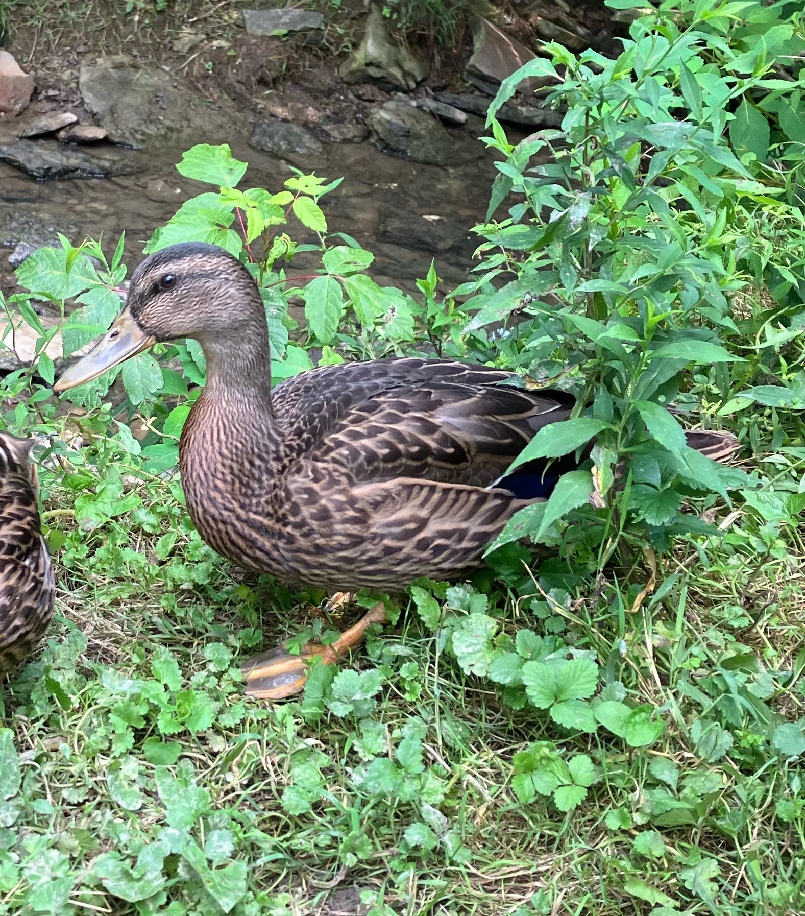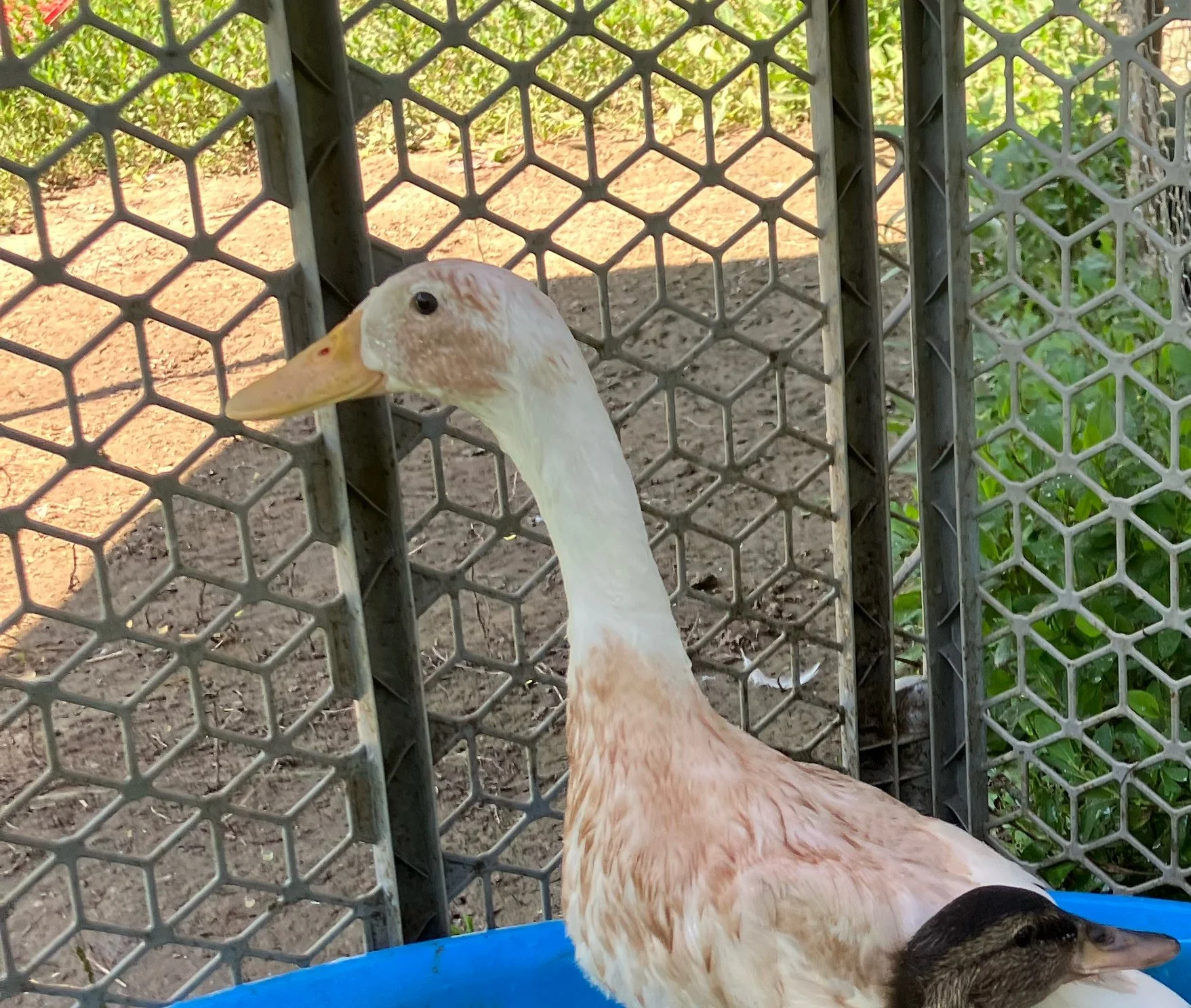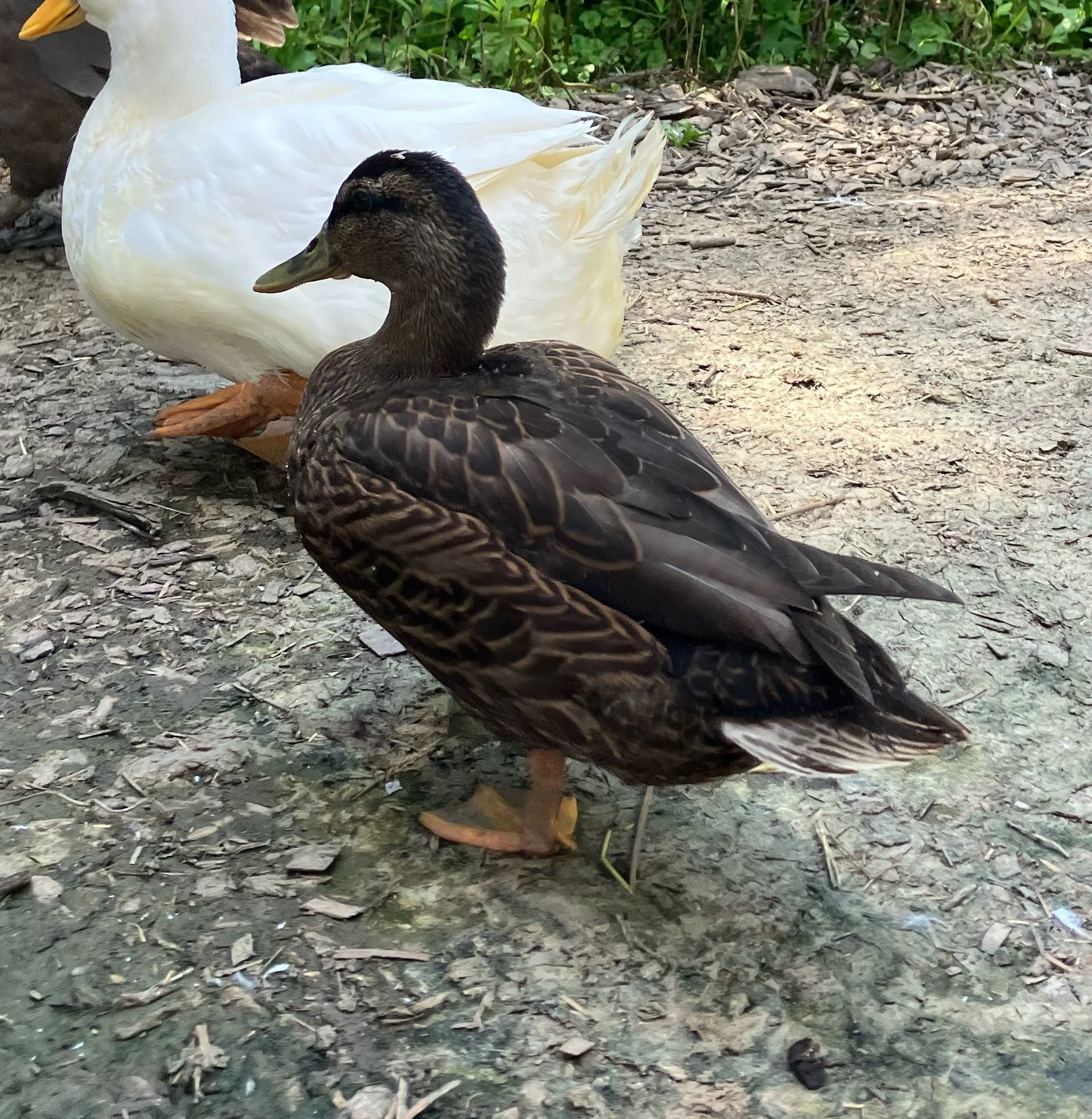 Piper (front) was found in someone’s yard stuck. After bringing her to us, After raising her duckling,, doesn’t seem in a hurry to rejoin the