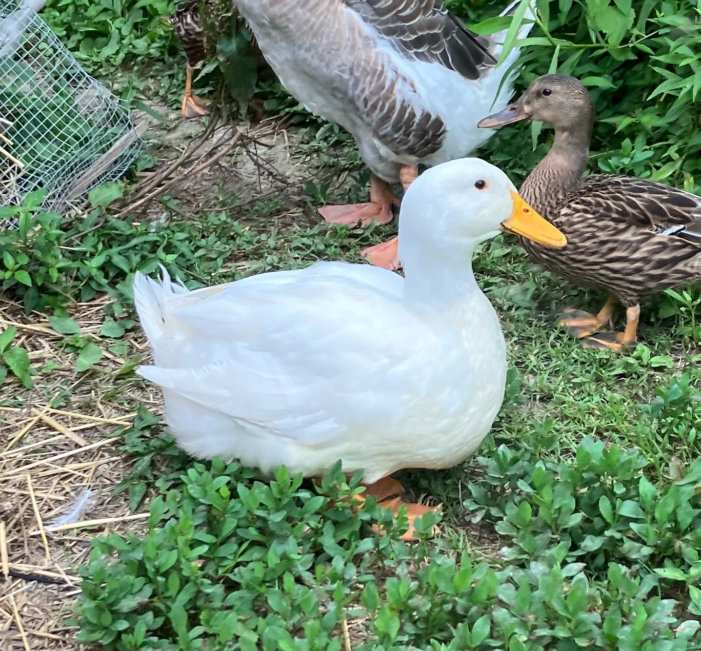 Pat is a Pekin female who was dumped as a duckling. Pat was found wandering the side of the highway at 4-6 weeks old. I picked her up and she's been part of the family ever since.